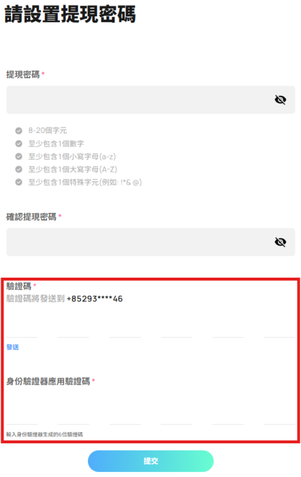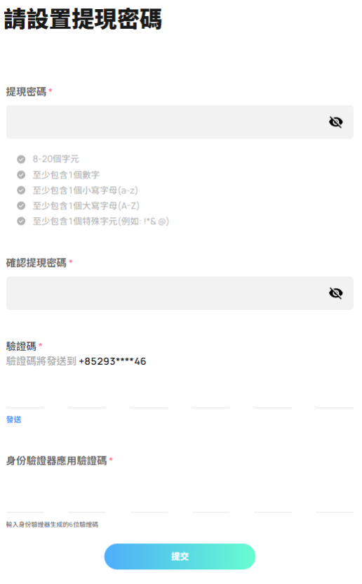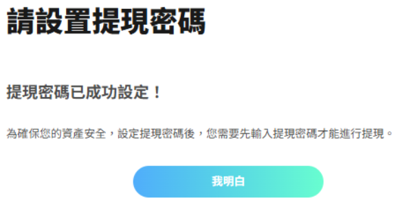 輸入所有信息後,點擊“提交”,您將收到一則確認通知,表明您的提現密碼已成功創建。