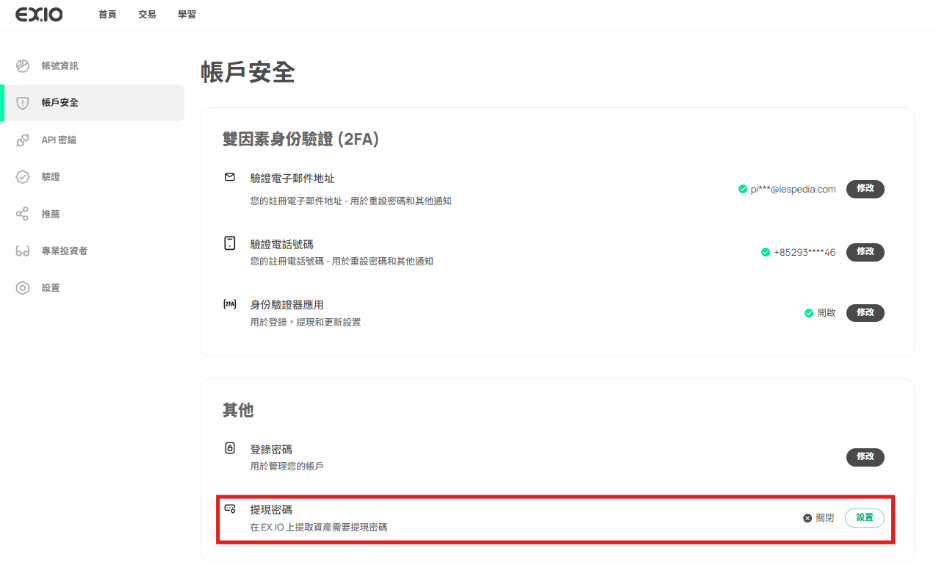 創建並確認一個符合 EX.IO 密碼要求的提現密碼。