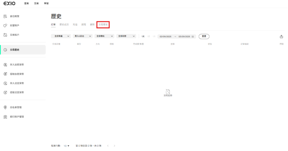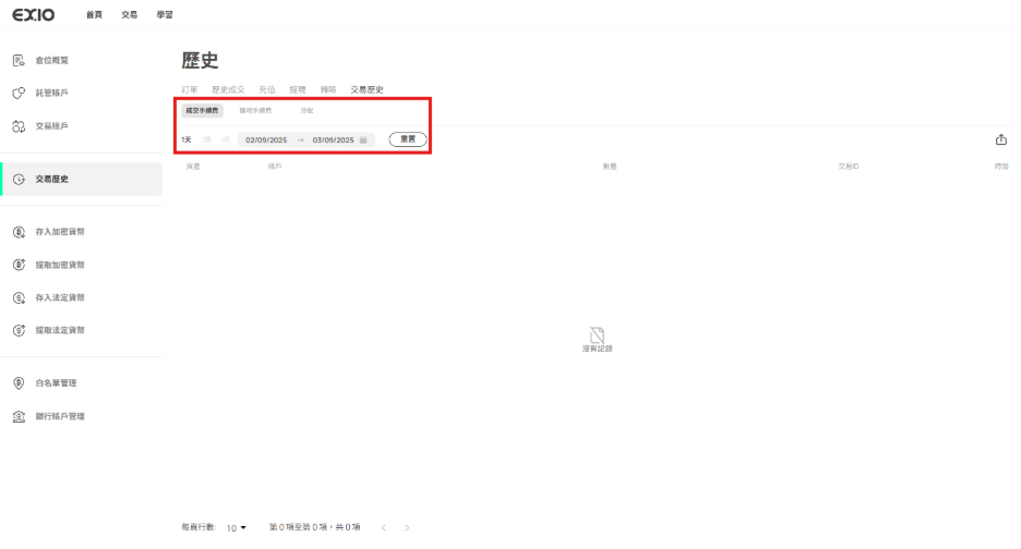 在「交易歷史」選項下,您可以根據所選日期過濾範圍查看您帳戶的成交手續費、提現手續費或分配費用。