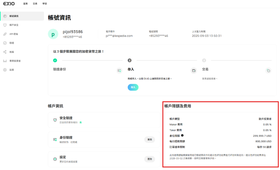 在「帳號資訊 」下,導航到帳戶限額和費用以查看您帳戶的maker/ taker費用。